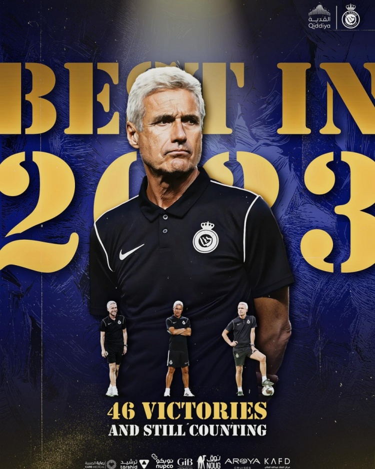 龙八国际11月17日讯 利雅得胜利社媒今日晒出海报,球队主帅路易斯-卡斯特罗2023年已经取得46场胜利,获胜次数居世界第一。