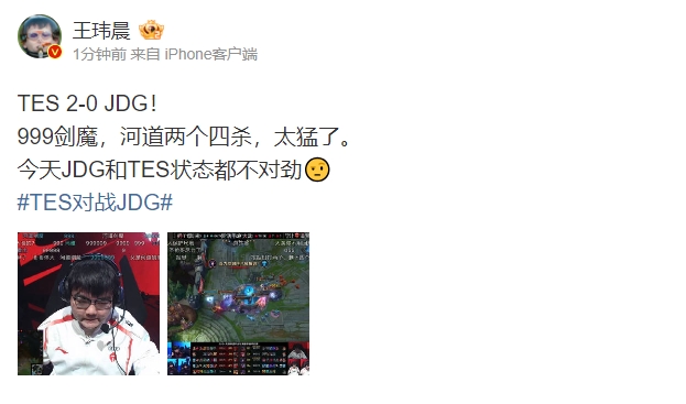 龙八国际4月7日讯 今日LPL季后赛TES对阵JDG的比赛正在进行,TES势头正盛拿下赛点。赛后电竞记者发文点评TES选手发挥。