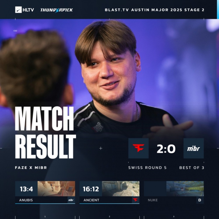 加时赛首回合s1mple大狙开场双杀后被insani找到反杀,鸡哥与雨神收割残局成功拆包拿分,s1mple大狙次回合三杀游龙让FaZe拿到赛点,最终FaZe16-14战胜MIBR,瑞士轮3-2挺进传奇组!