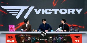 【25:43】T1轻松吃掉大龙,河道Oner先手控住knight将其秒杀,小吕布烬一枪带走ON,多兰补掉beichuan人头,T1打出0换4,一波推平BLG基地先下一城。