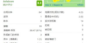 龙八国际9月8日讯 欧冠小组赛首轮,国米主场0-2负于拜仁,奥纳纳本场数据如图。
