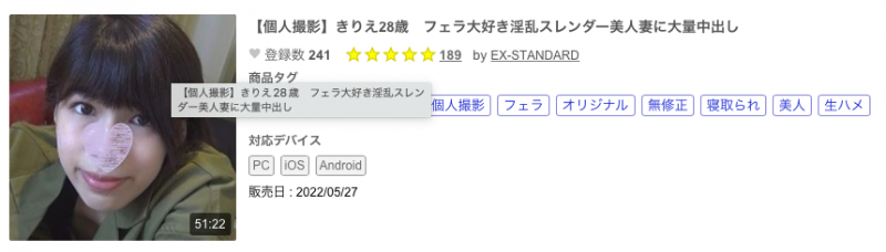 这是5月底时由卖家「EX-STANDARD」于FC2网站贩售、番号为FC2-PPV-2411858的无码片,从标题「【個人撮影】きりえ28歳 フェラ大好き淫乱スレンダー美人妻に大量中出し」就知道这位名为きりえ的28岁人妻身材苗条纤细是个让人想给她老公戴绿帽的美人,然后上了床她会像感染丧尸病毒一样狂暴化,不但会露出淫乱的阿嘿颜还会配合你任何过份的要求,所以这位卖家不客气了,把最浓的一发大龙炮全部灌浆进了她的体内⋯